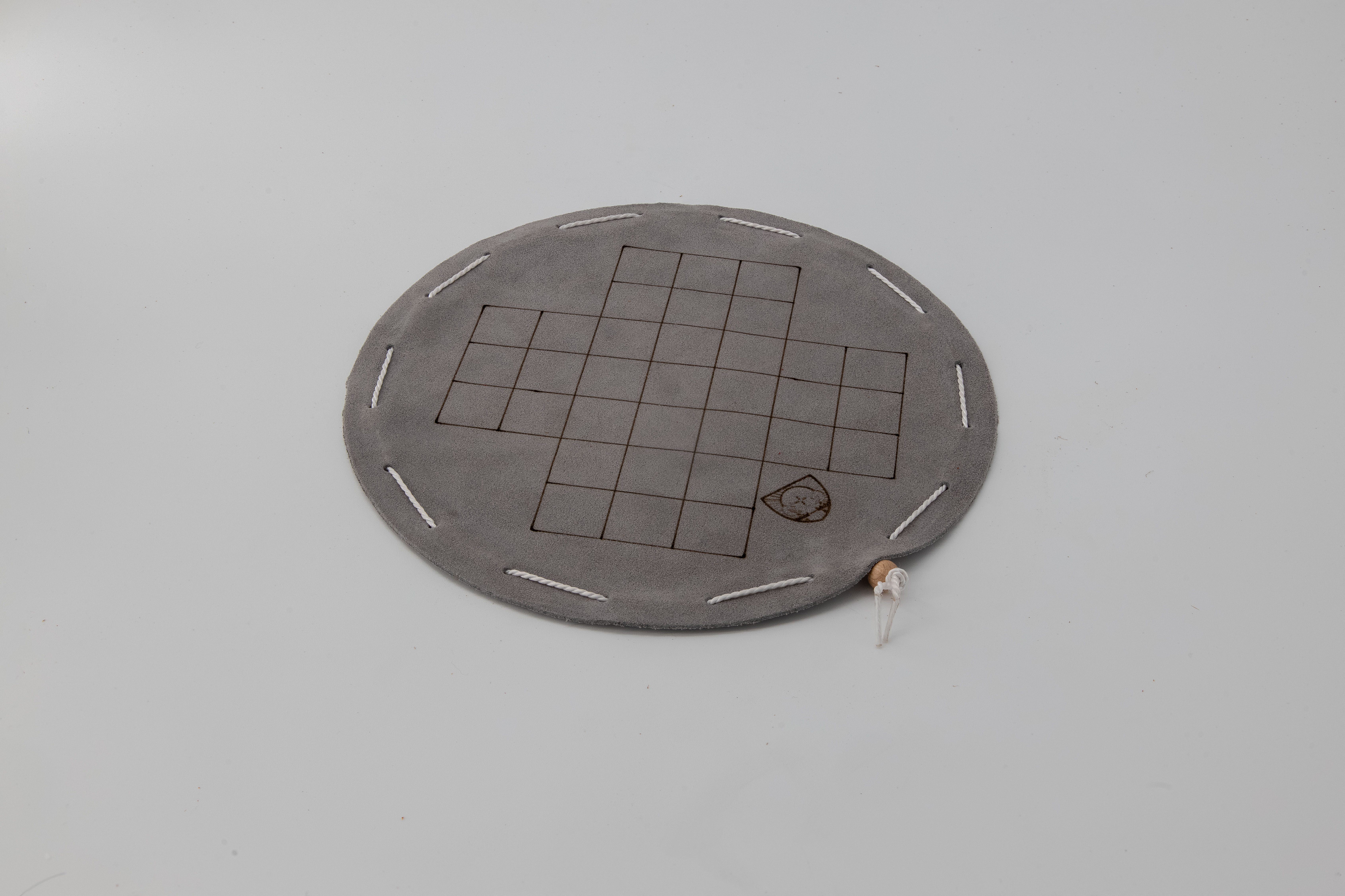 Our board games are branded onto leather, making them long-lasting. And for transportation, the game packs itself almost by itself. The only thing you have to do is press the game lightly downwards with a finger in the middle of the playing field, then pull on the string and the game has packed itself. It should stay that way for transportation. So now all you have to do is push the bead up to the bag that has just formed and the game is ready to go. The games can be used in this way on hikes, on bike tours, in the car or even on long flights. The games are packed so small that the pocket of a jacket is enough to take this pleasant form of entertainment with you.
